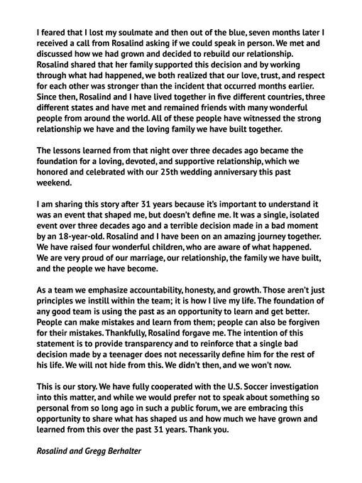 Berhalter knows he was in the wrong. He doesn’t need me or any other journalist to lambast him for something that happened over 30 years ago. It’s definitely not my place to criticize Berhalter or Rosalind for reconciling their differences after seven months. I’m glad that the two could reestablish the level of trust necessary for a successful relationship, and I hope their marriage has been nothing but happy and healthy in the years since.