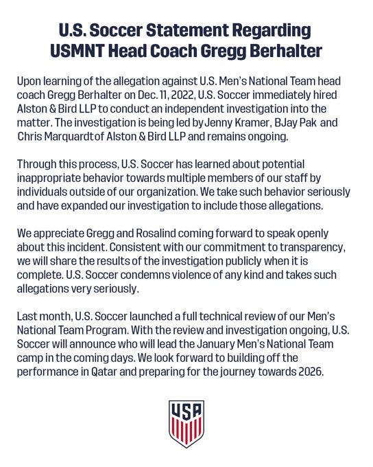An ongoing legal investigation into an allegation against Gregg Berhalter. Reports of “inappropriate behavior” toward U.S. Soccer officials by “individuals outside of our organization.” Most indicative of the situation, as I came to learn, was one word buried in the latter half of the statement: