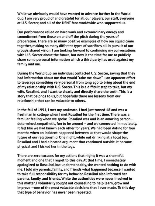 What Gregg Berhalter did is deplorable and indefensible. His age and his immaturity are not valid excuses. No amount of alcohol can justify his actions. I applaud Rosalind’s brave decision to take herself out of the situation, and I can only hope that she received the proper care (physical and mental) following the altercation.